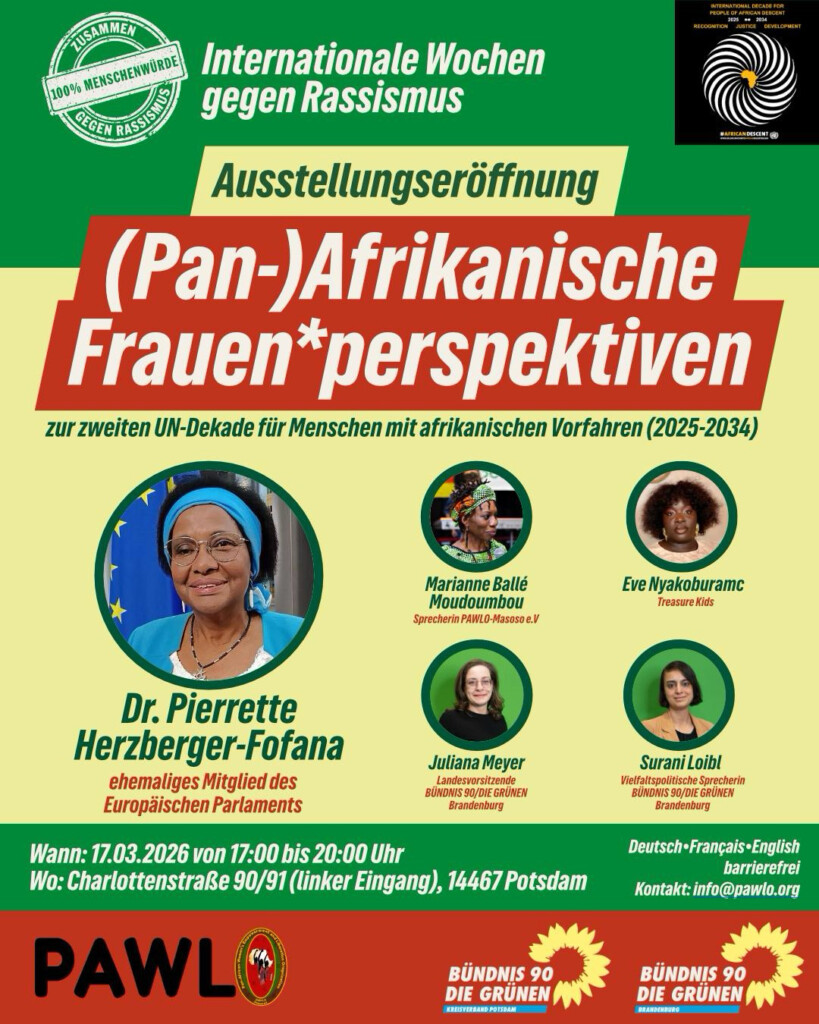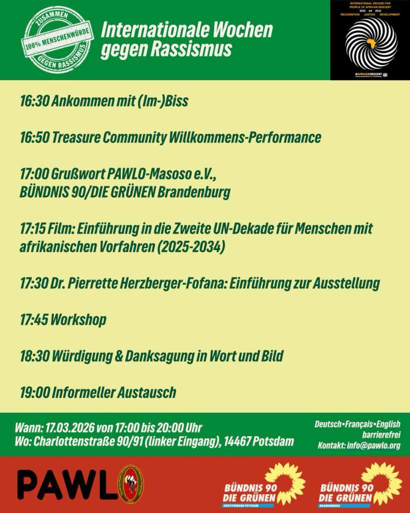 Zum Auftakt dieser Ausstellungseröffnung wird Dr. Pierrette Herzberger-Fofana Einblicke in Ihre Arbeit im Europäischen Parlament, für die Förderung des Black History Months und der 1. und 2. Dekade für Menschen mit afrikanischen Vorfahren geben. Grußworte halten Juliana Meyer, Landesvorsitzende Bündnis 90/Die Grünen Brandenburg, und Surani Loibl, Vielfaltspolitische Sprechering Bündnis 90/Die Grünen Brandenburg. Marianne Balle Moudoumbou, Bundessprecherin der panafrikanischen Frauenorganisation PAWLO-Masoso wird durch das Workshop leiten und Eve Naakoburamc, Leiterin von Treasure Kids, uns thematisch in Bewegung halten.